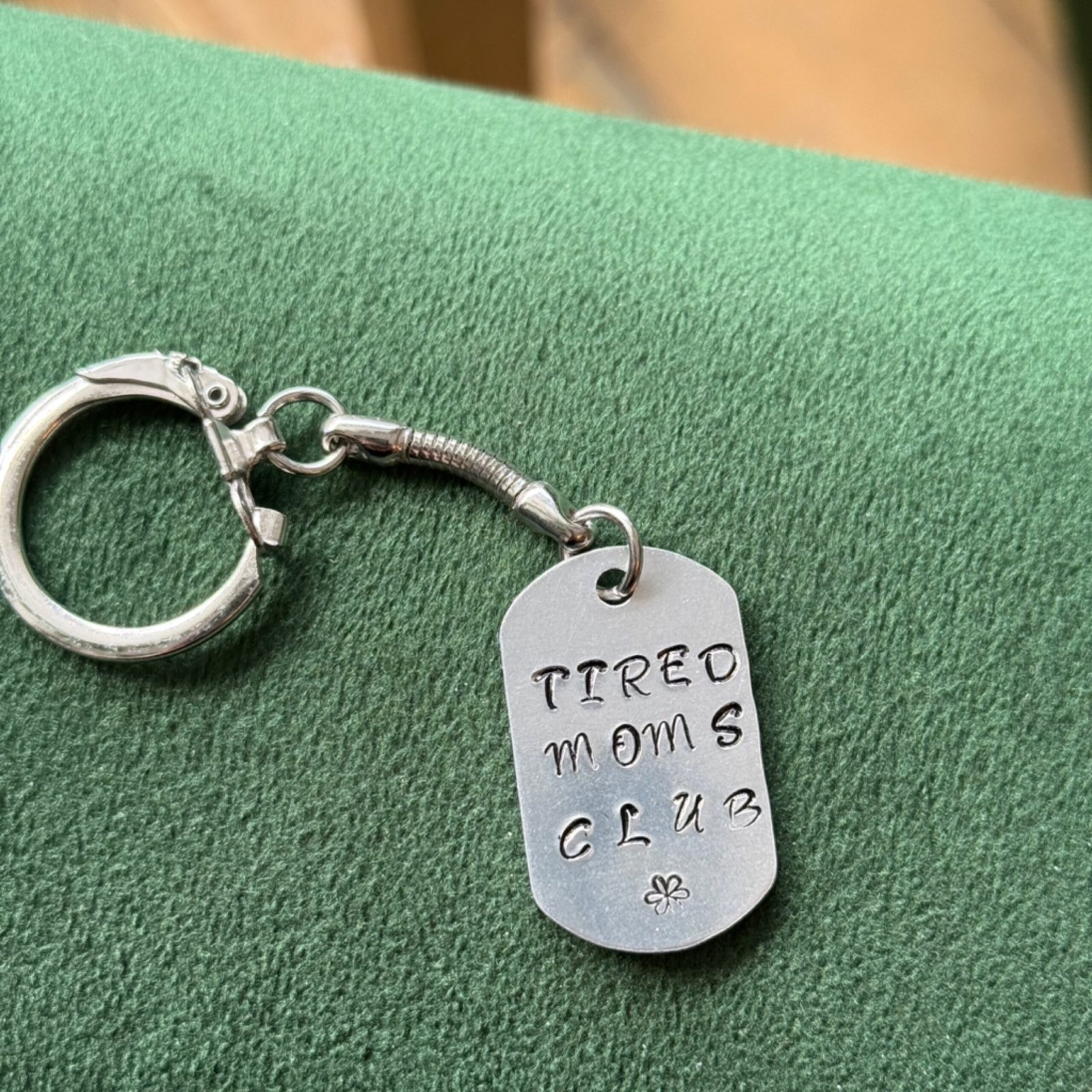 Tired moms club hand stamped keychain
